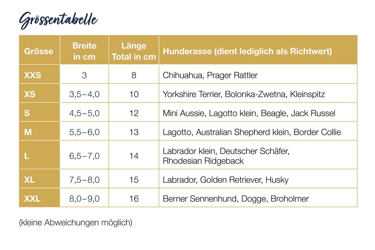 Tipp: Falls Ihr Liebling seine Pfote nicht gerne vermessen lässt, können sie einen Abdruck auf ein Blatt Papier seiner angefeuchteten Pfote machen und anschliessend die Pfote anhand des Abdrucks messen.