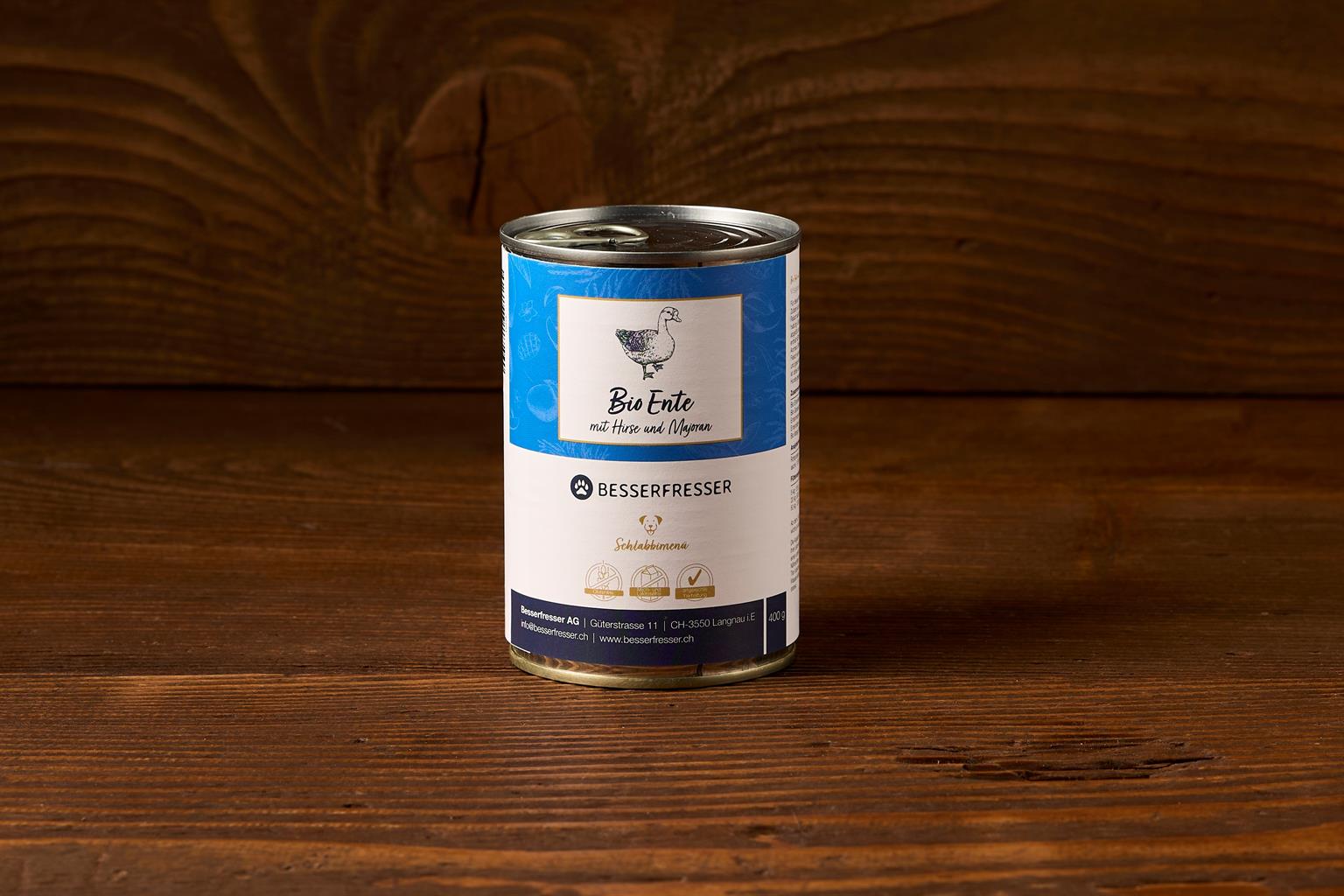 Bio Entenfleisch 53%, Trinkwasser 13%, Bio Gänseschmalz 10%, Bio Hirse 5%, Bio Entenherzen 4%, Bio Entenleber 4%, Bio Entenhälse 4%, Bio Entenkarkassen 3%, Bio Mango 3%, Bio Majoran 1%