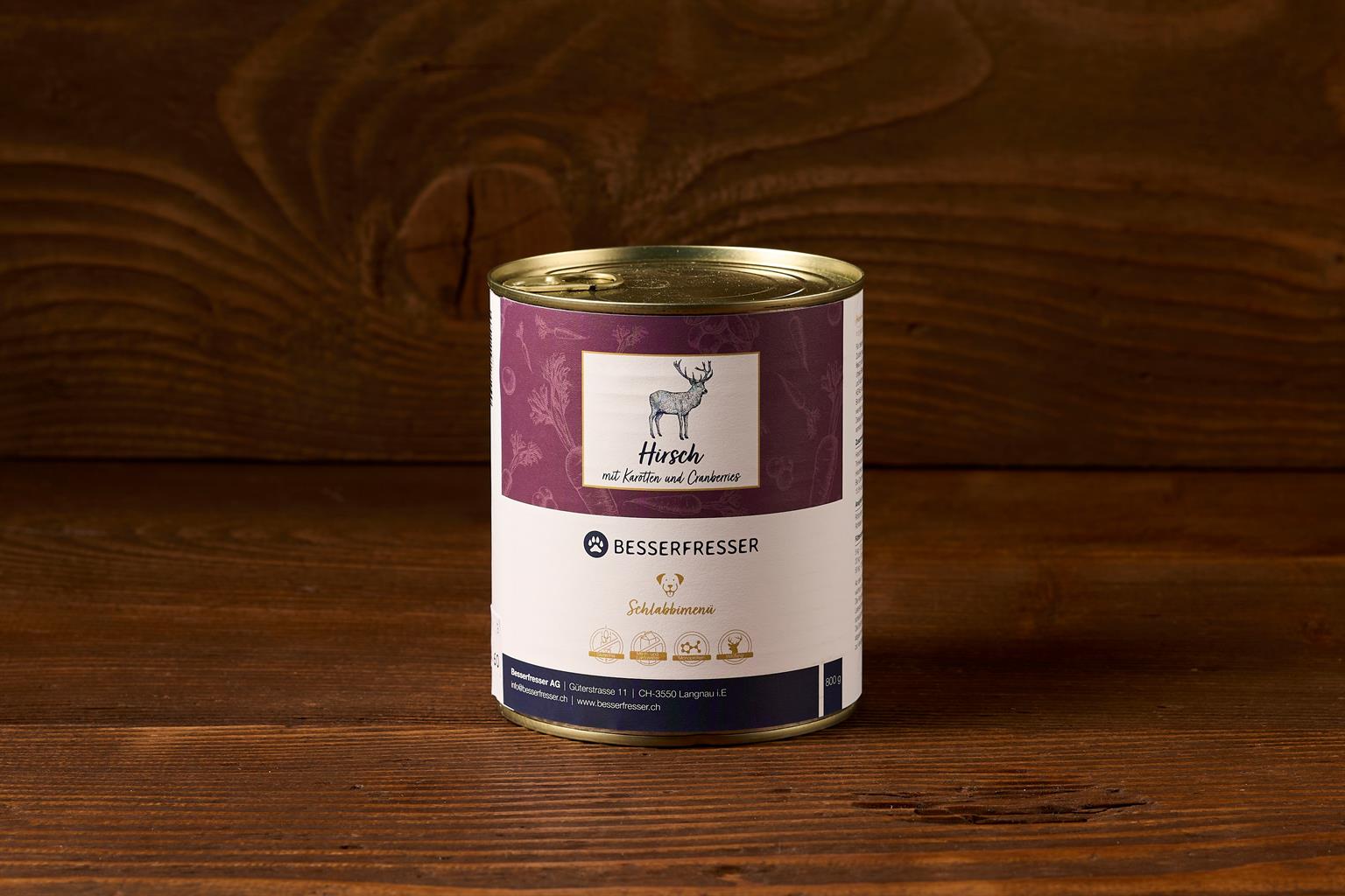 Hinweis: Der Hirsch stammt aus seinem natürlichen Umfeld und wird zur Bestandesregulierung gejagt. Leider werden vermehrt nicht magnetische Projektile bei der Jagd eingesetzt, welche sich dann bei der Verarbeitung nicht orten lassen. Es besteht somit die Gefahr von Querschlägern, welche bei der Produktion übersehen werden können. Diese Problematik kennt man auch im Humanbereich. Auch wenn dies selten vorkommt, bitten wir Sie trotzdem, das Menü Hirsch im Napf Ihres Vierbeiners immer mit einer Gabel zu zerdrücken damit Sie mögliche Nicht-Ferro-metallhaltige Schüsse erkennen und entfernen könnten.
