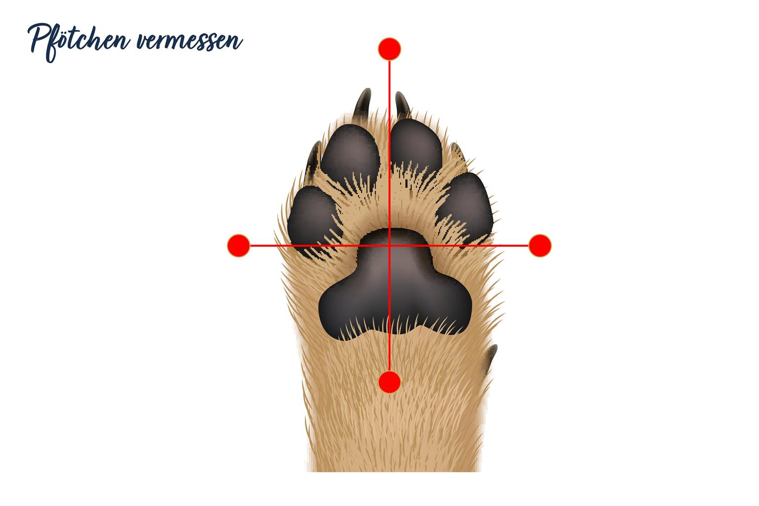 Attention : mesurez la patte lorsqu'elle est chargée par votre chien. La patte n'est pas aussi large lorsqu'elle n'est pas chargée que lorsqu'elle l'est. Les chaussons de protection de la patte peuvent être trop étroits plus tard lors d'une mesure à l'état non chargé et restreindre la marche de votre compagnon à quatre pattes !